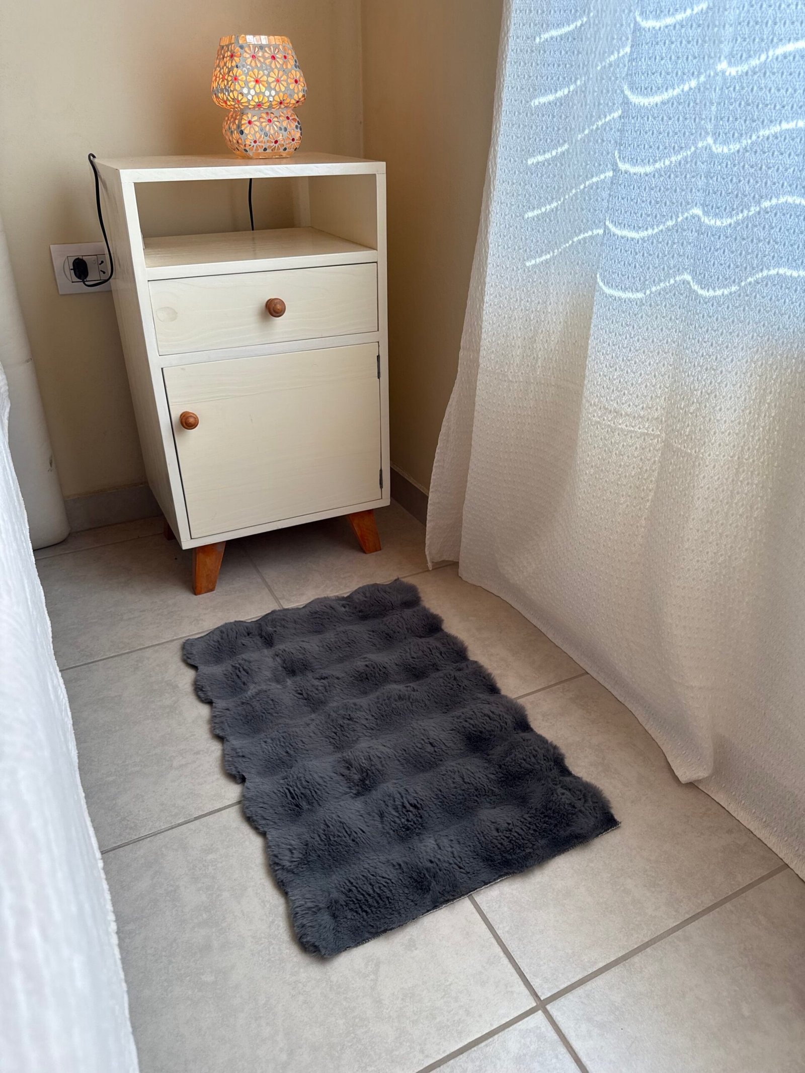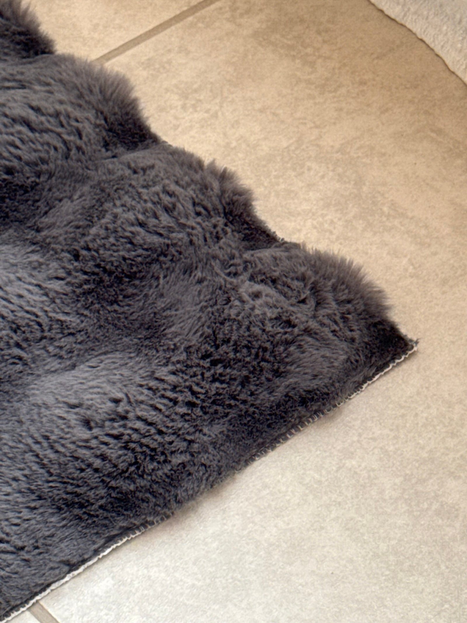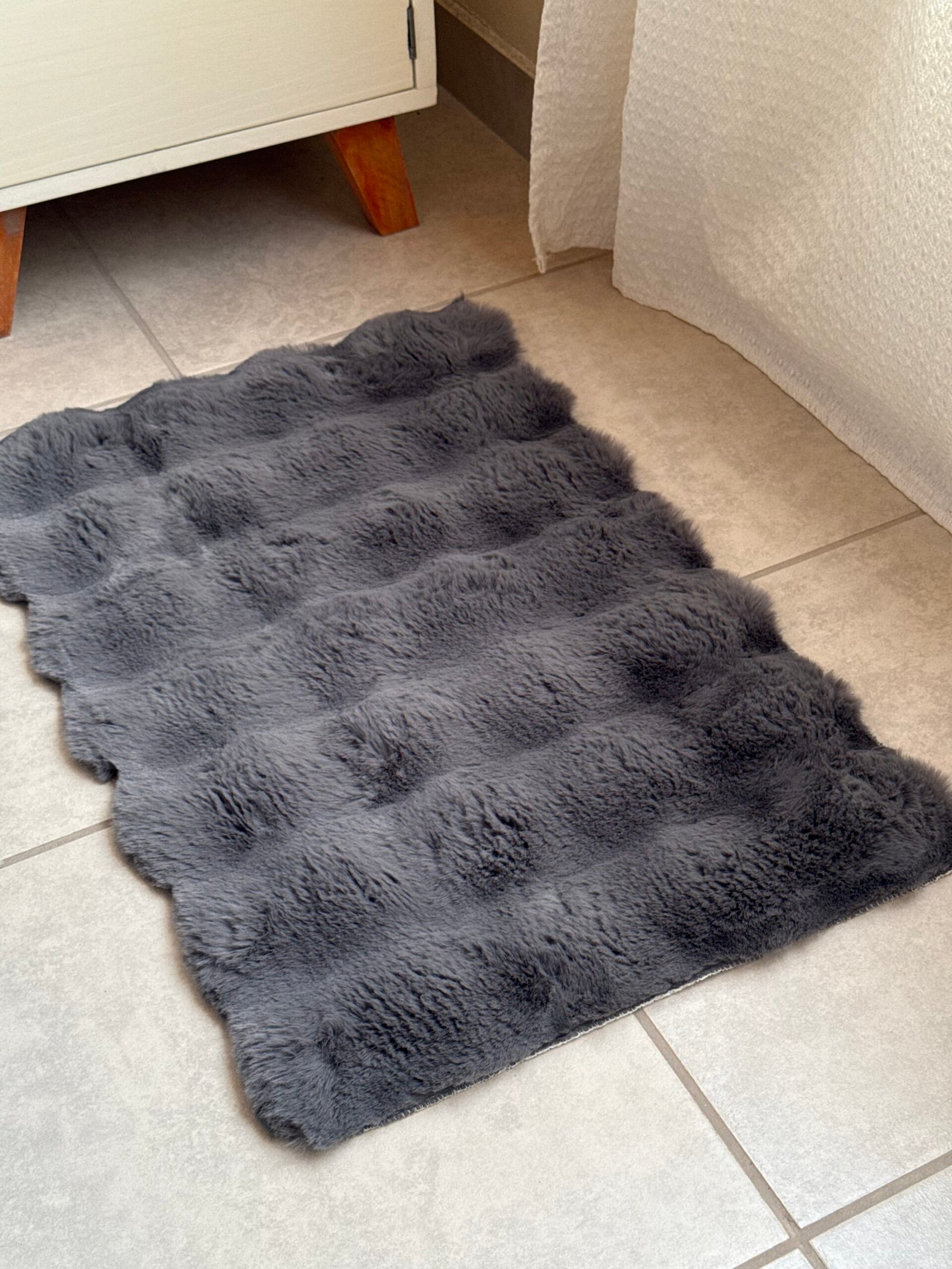Color: GRIS Medidas: 40 cm x 60 cm. Con antideslizante. Super suave, pelo corto, piel de conejo.