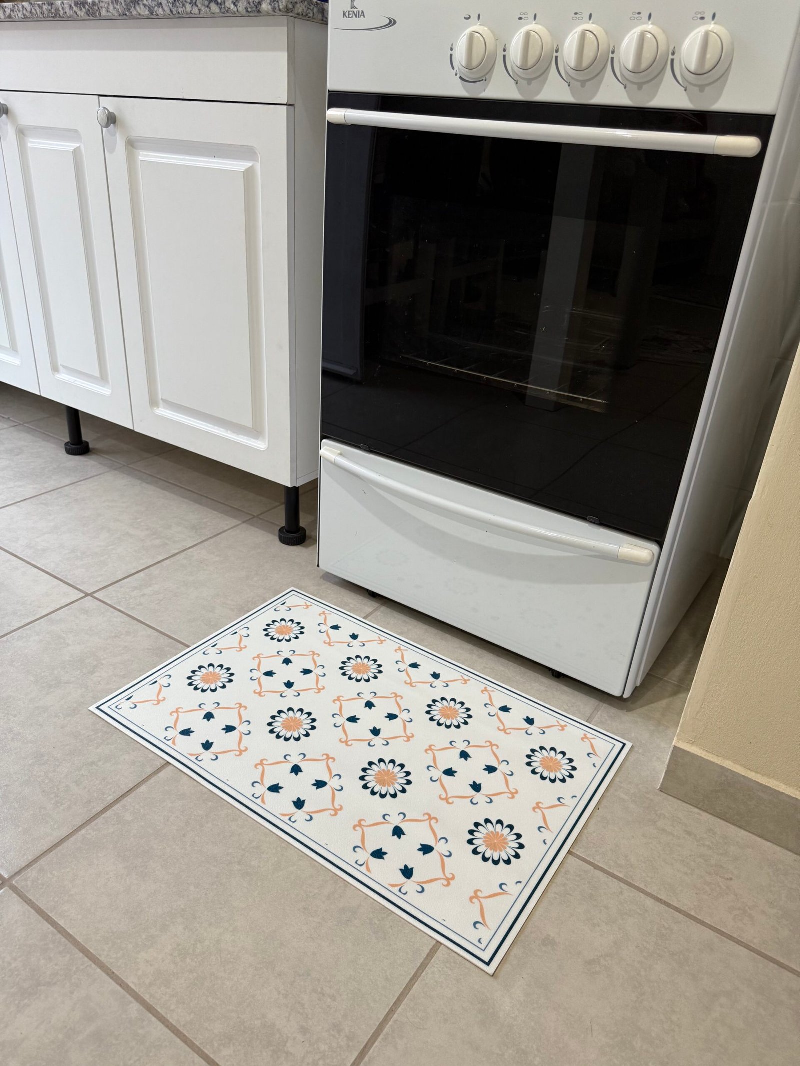 ALFOMBRA VINILICA, 40 cm x 60 cm DISEÑO FLORAL GEÓMETRICA AZUL Y DURAZNO. Ideal para cocina o el lugar que mas te guste. PROTEGE SUELO DE MANCHAS, DERRAMES, Y DESGASTES. FACIL DE LAVAR, IMPERMEABLE, ANTIDESLIZANTE.