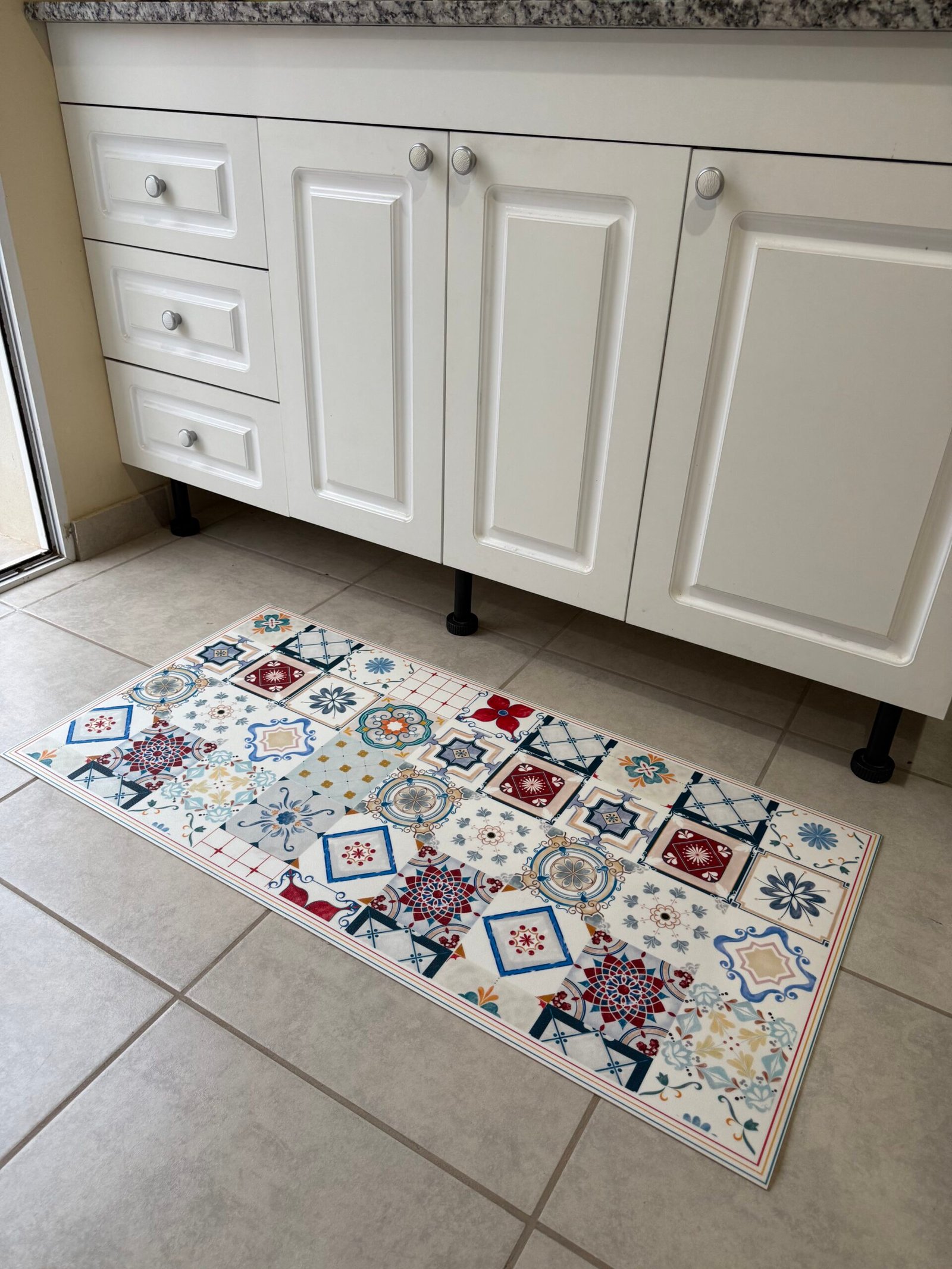 ALFOMBRA VINILICA CON DISEÑO TIPO MOSAICO EN TONOS AZULES, ROJOS Y BEIGE. Ideal para cocina o el lugar que mas te guste. PROTEGE SUELO DE MANCHAS, DERRAMES, Y DESGASTES. FACIL DE LAVAR, IMPERMEABLE, ANTIDESLIZANTE.