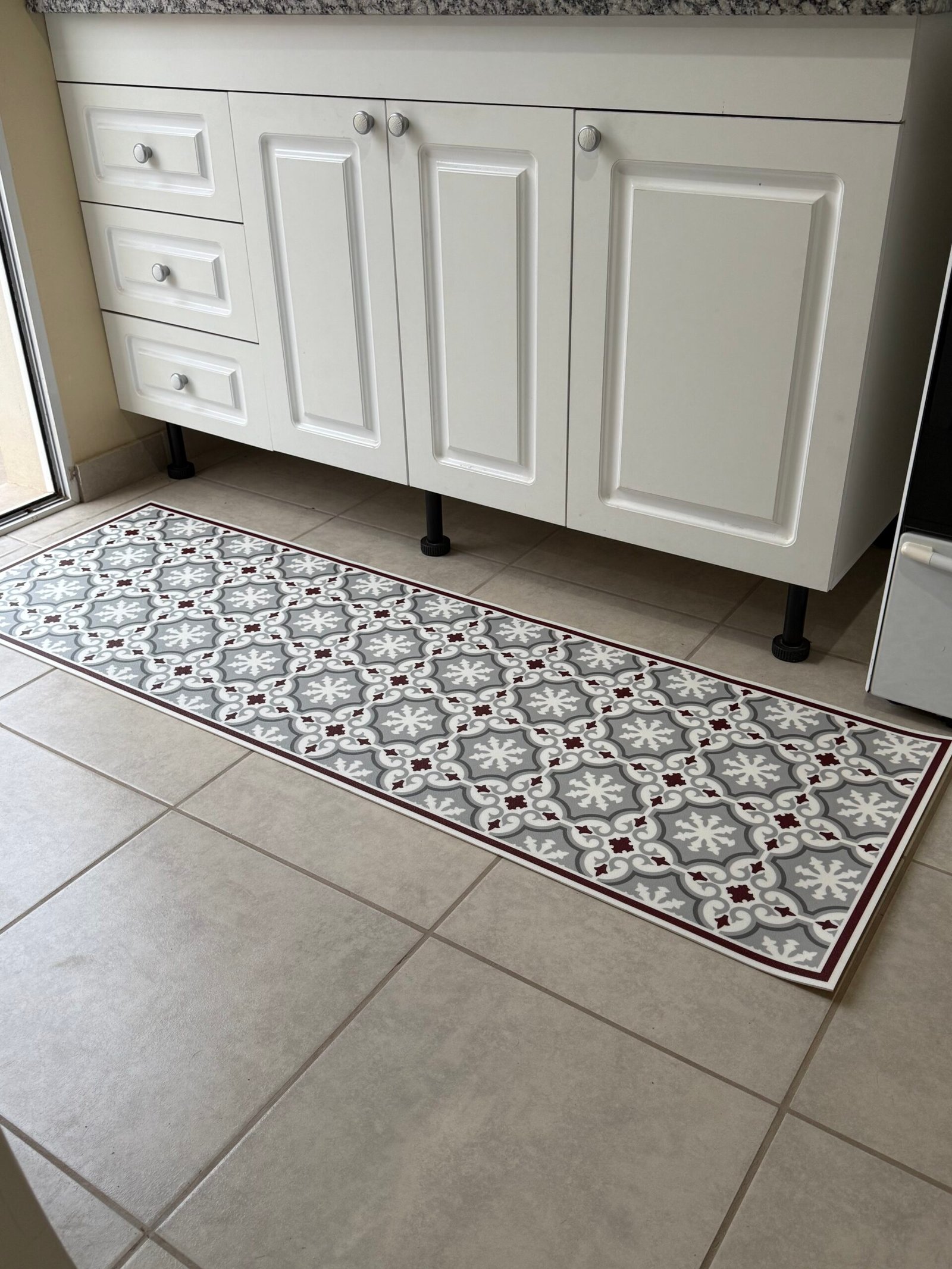 ALFOMBRA VINILICA EFECTO HIDRAÚLICO CON TONALIDAD BORDO Ideal para cocina o el lugar que mas te  guste. PROTEGE SUELO DE MANCHAS, DERRAMES, Y DESGASTES. FACIL DE LAVAR, IMPERMEABLE, ANTIDESLIZANTE.