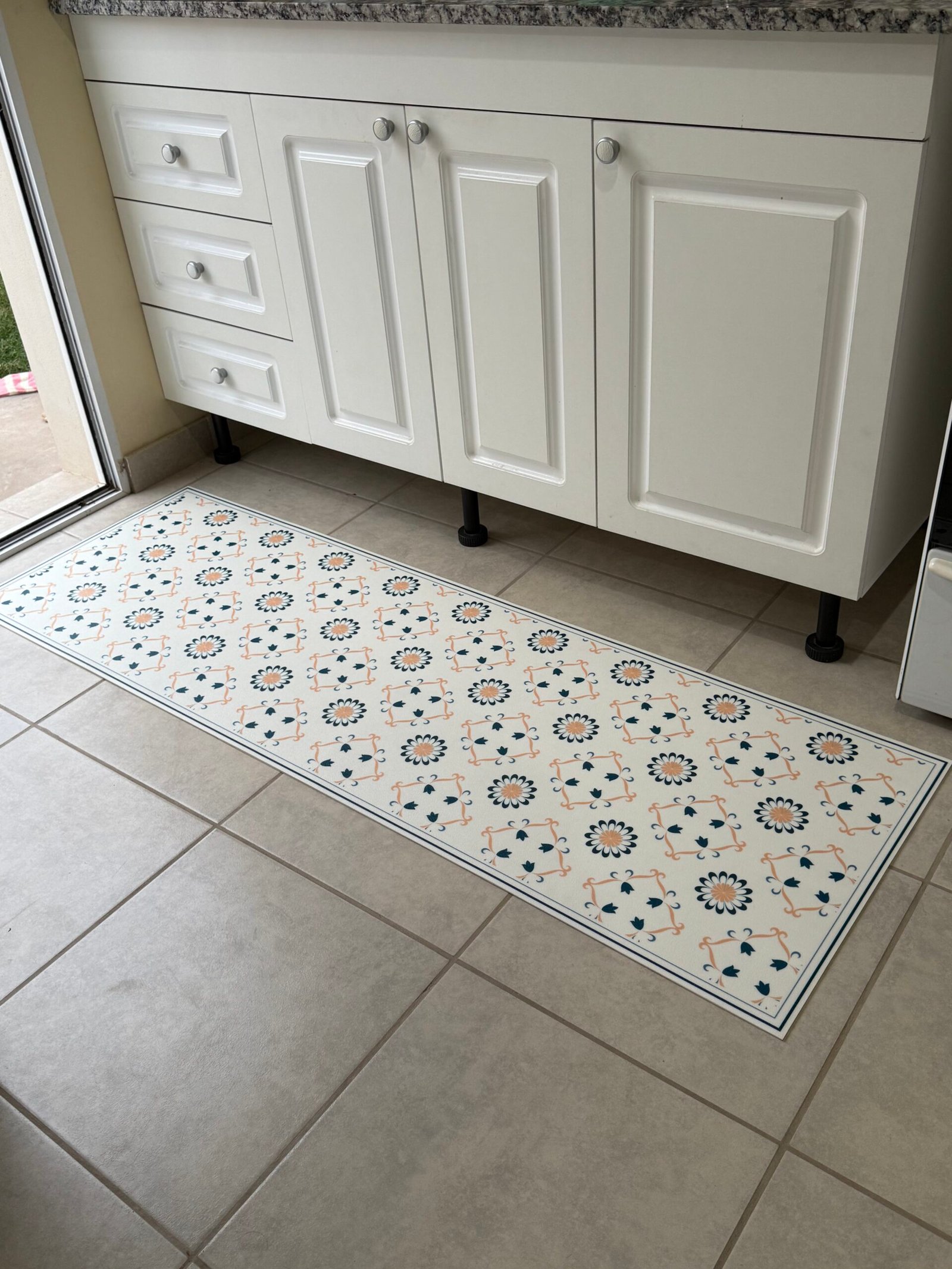 ALFOMBRA VINILICA FLOR GEOMÉTRICA AZUL Y DURAZNO Ideal para cocina o el lugar que mas te  guste. PROTEGE SUELO DE MANCHAS, DERRAMES, Y DESGASTES. FACIL DE LAVAR, IMPERMEABLE, ANTIDESLIZANTE.