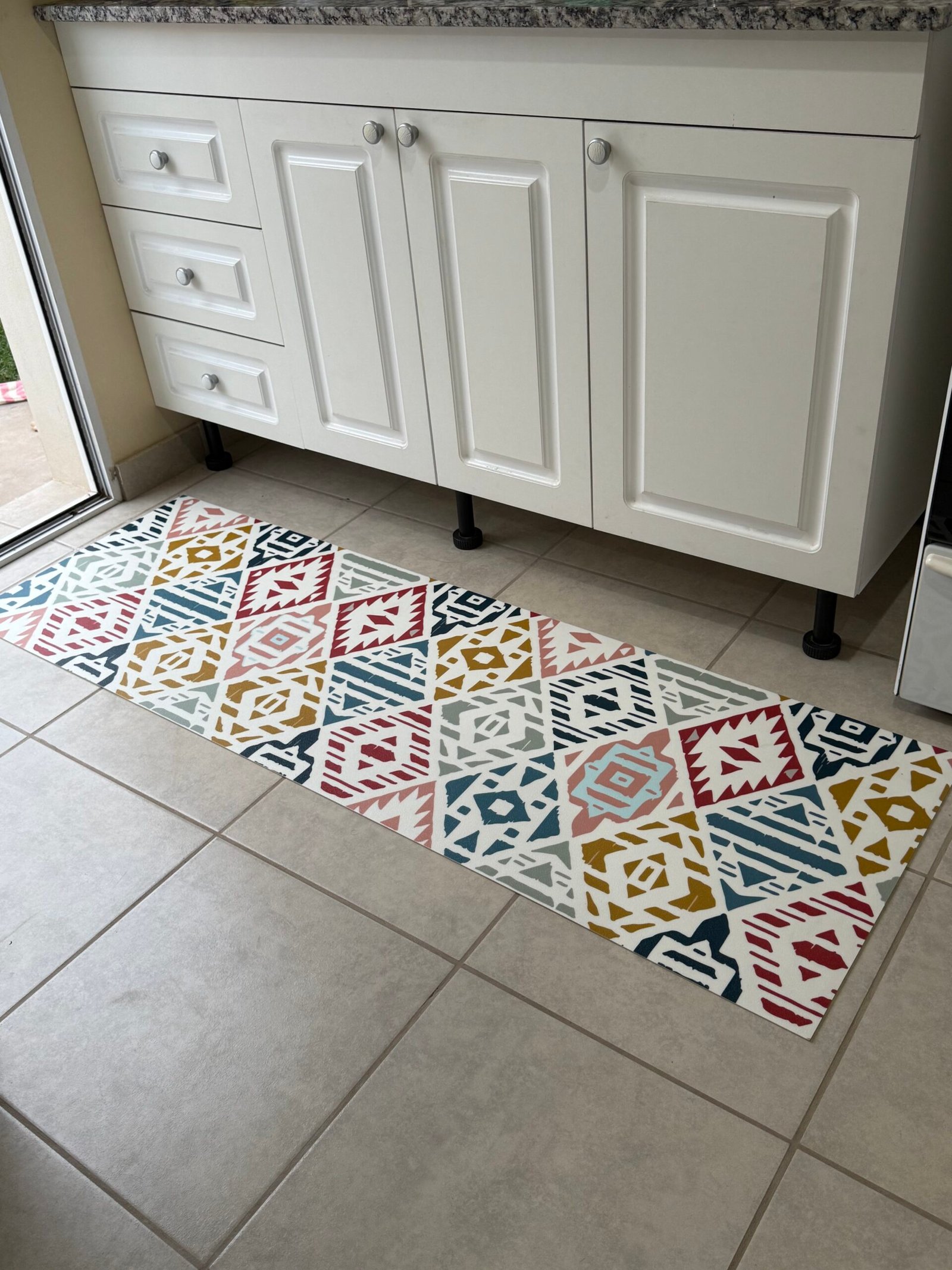 ALFOMBRA VINILICA DISEÑO ROMBOS MULTICOLOR Ideal para cocina o el lugar que mas te guste. PROTEGE SUELO DE MANCHAS, DERRAMES, Y DESGASTES. FACIL DE LAVAR, IMPERMEABLE, ANTIDESLIZANTE.