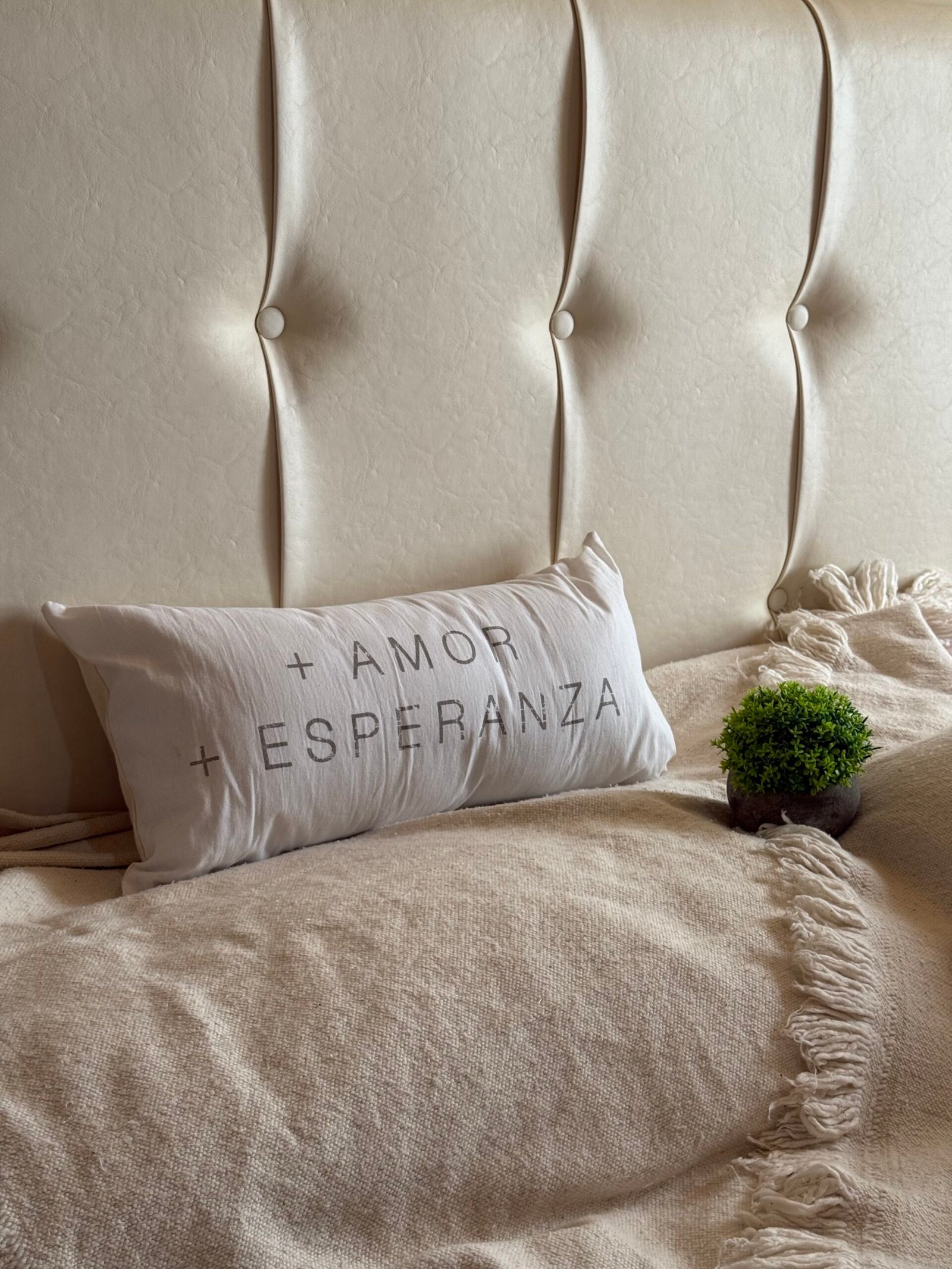 El ‘Almohadón con frase más AMOR más ESPERANZA’ es más que un accesorio decorativo; es una manifestación de positividad y elegancia para tu hogar. Con un diseño que incorpora palabras llenas de esperanza y amor, este almohadón toma lugar central en espacios donde buscas motivación y tranquilidad. Con su tamaño de 25 cm x 50 cm, este almohadón se adapta perfectamente a camas, sofás y sillones.