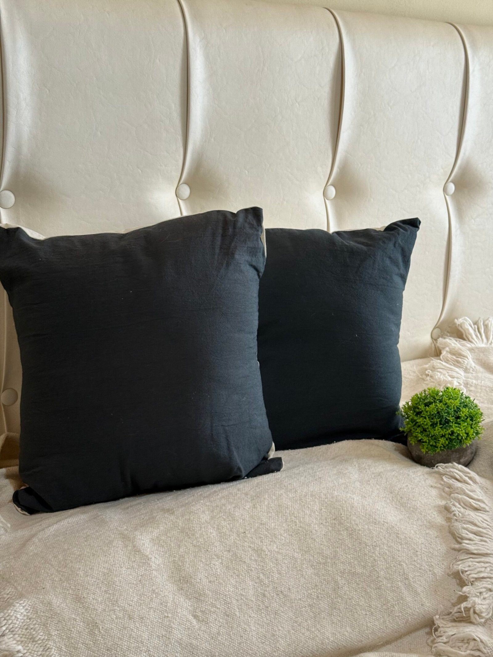 El SET X2 DE ALMOHADONES NEGROS LISOS DE 40CM X 40CM es la elección ideal para quienes buscan agregar un toque elegante y moderno a cualquier ambiente. Su diseño sobrio y color neutro se adapta perfectamente a diversas decoraciones, desde estilos minimalistas hasta interiores más sofisticados. Estos almohadones no solo aportan confort, sino también una estética refinada que transformará tu espacio.